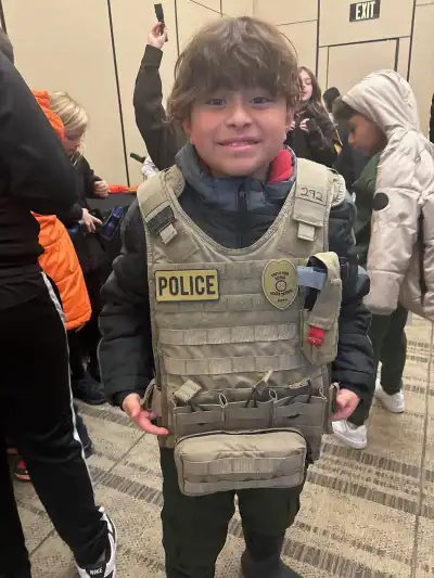Image caption: Future in uniform! A student gets hands-on with police gear during the 4th Grade Equipment Exploration Fair.